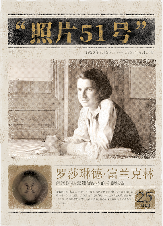 DNA双螺旋结构的发现堪称现代生物学史上一项划时代的成就。沃森和克里克发现“双螺旋”的故事可谓人尽皆知。但是,你知道吗她所拍摄的DNA晶体衍射图片——“照片51号”是解密DNA双螺旋结构的关键线索。此物质的相关数据,为沃森、克里克得出DNA结构起到了决定性作用。而照片的拍摄者就是英国物理化学家罗莎琳德·富兰克林。