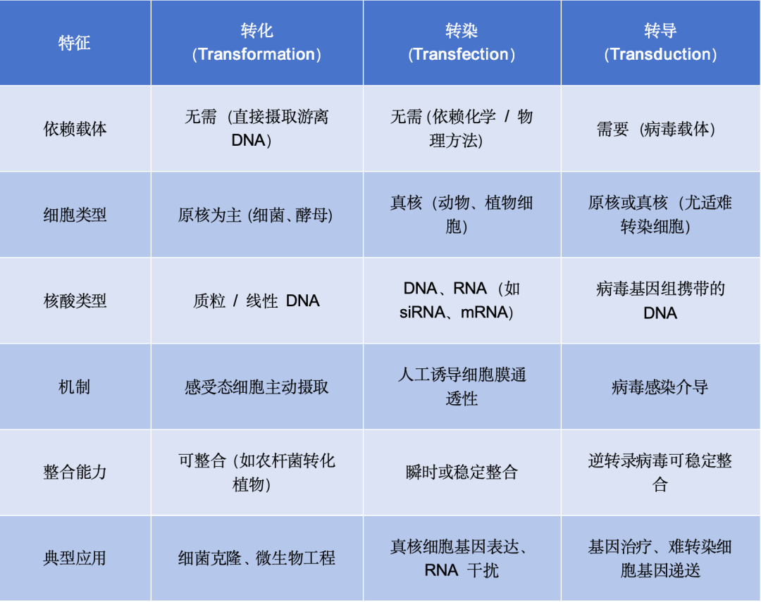 转化:原核细胞“吃” DNA,简单直接,常用于细菌和酵母。 转染:真核细胞“人工喂” 核酸,依赖化学 / 物理手段,适用于可转染的真核细胞。 转导:借病毒“感染” 细胞,高效递送,尤其适合难转染细胞或基因治疗。